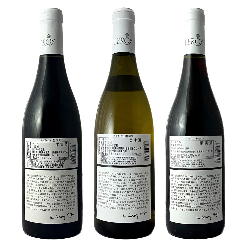 2018 ブルゴーニュ ルージュ(赤) 、2018 ブルゴーニュ ブラン(白)、2024 マコン ルージュ(赤) 各750ml×1本
