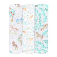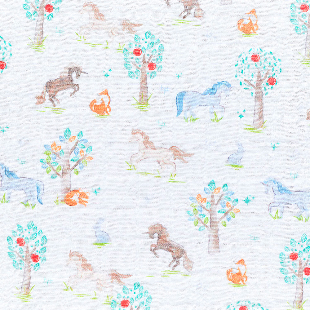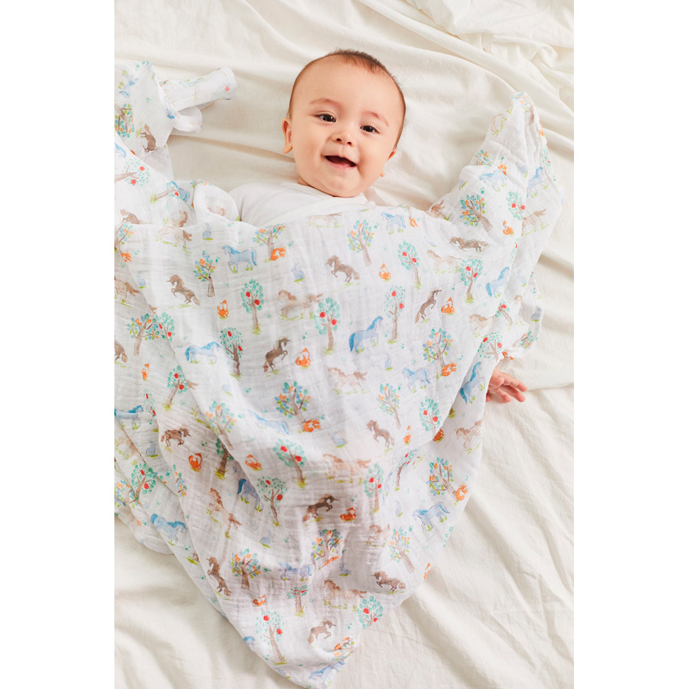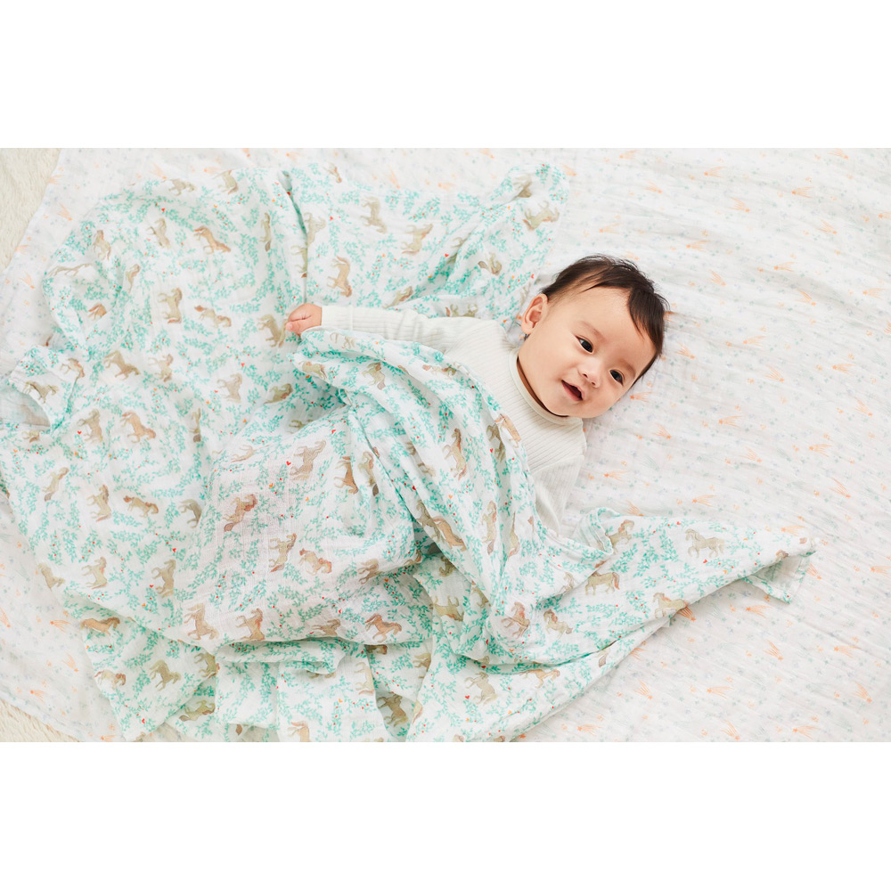 -干支コレクション「Year of the Horse」-2026年の干支柄コレクションは、午(うま)をモチーフにしたデザインです。まるでおとぎ話のワンシーンを切り取ったような、 やわらかで華やかなアートワークが魅力。生まれ年の干支をモチーフにしたアイテムは、性別を問わず贈りものにもおすすめです。aden + anais(エイデンアンドアネイ)を代表するコットンモスリン素材で作られたスワドル。実用的な3枚セットで、毎日の育児に欠かせないアイテム。コットンモスリンは、細やかな織りが特徴で、ムレを防ぎながら、体温調整がまだ難しい赤ちゃんを快適にサポートします。大判サイズなので多用途に使え、外出時もコンパクトに持ち運べます。