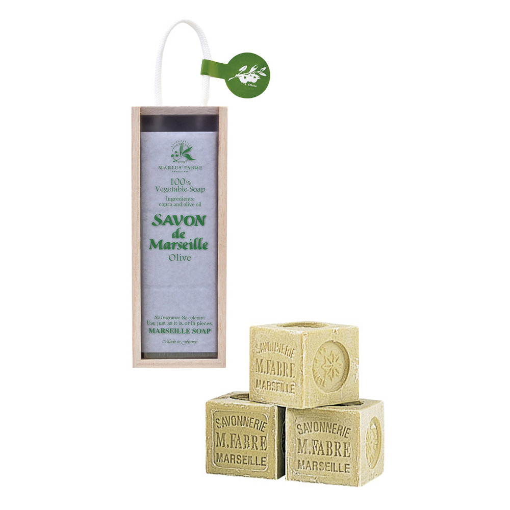 人工香料・着色料・防腐剤を使用せず、天然植物油を主原料として作られた石けんです。泡切れが良く、洗浄力があり、お肌をしっとり洗い上げます。約200gのキューブ型のマルセイユ石けんを3個、木箱にセットしました。