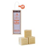 人工香料・着色料・防腐剤を使用せず、天然植物油を主原料として作られた石けんです。泡切れが良く、洗浄力があり、お肌をしっとり洗い上げます。約200gのキューブ型のマルセイユ石けんを3個、木箱にセットしました。