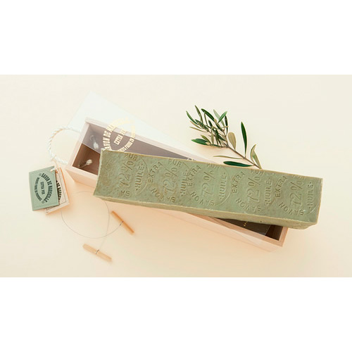 着色料・防腐剤を使用せず、100%天然植物油をベースに作ったフランス製の自然派石けんです。付属のワイヤーでカットしながらご使用ください。