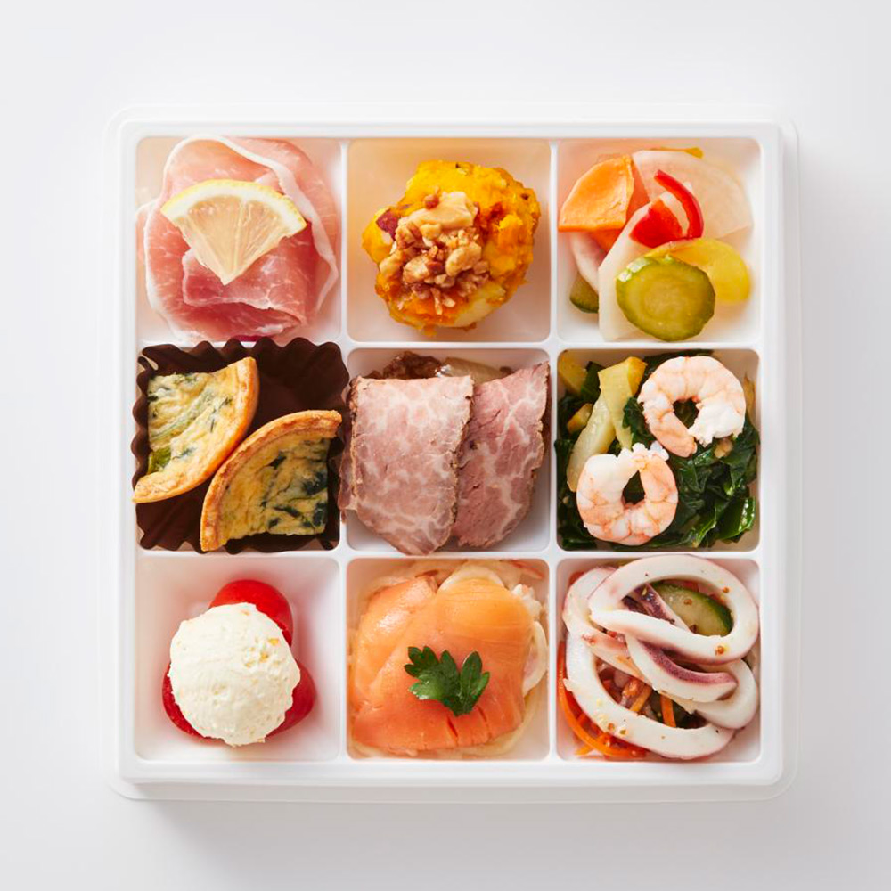 生ハムとオニオンのマリネ、カボチャのサラダ、甘酢サラダ、ほうれん草とベーコンのミニキッシュ、薄切りローストビーフと揚げごぼうのサラダ、海老のペペロンチーノ風、トマトとオレンジ風味のクリームチーズ、サーモントラウトのパスタサラダ、イカと野菜のマリネ