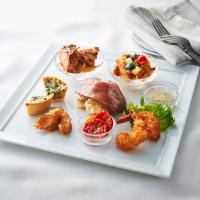 牛肉のグリル、グリルチキン バーベキューソース、小海老のフライ(タルタルソース付き)、白身魚のフリット、ペンネボロネーゼ、セミドライトマト、ほうれん草とベーコンのミニキッシュ