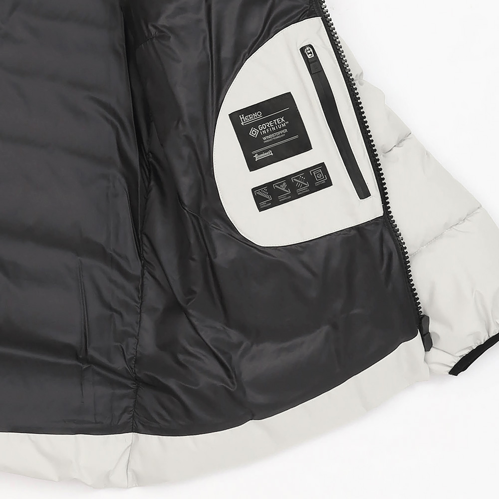 「GORE-TEX INFINIUM(2層構造)」防風、保温、透湿性に優れた”GORE-TEX”の2層構造(2LAYER)ファブリクス。3層構造の生地と比較すると、軽く柔らかな着心地が特徴。止水テープを使用していないため、完全防水ではないものの、タウンユースで着用する分には充分な撥水性能が備わっています。