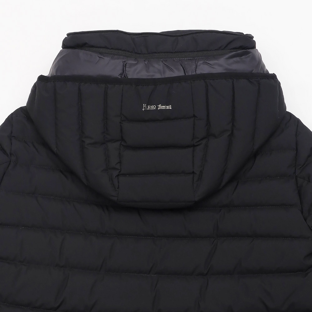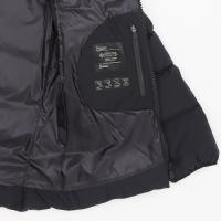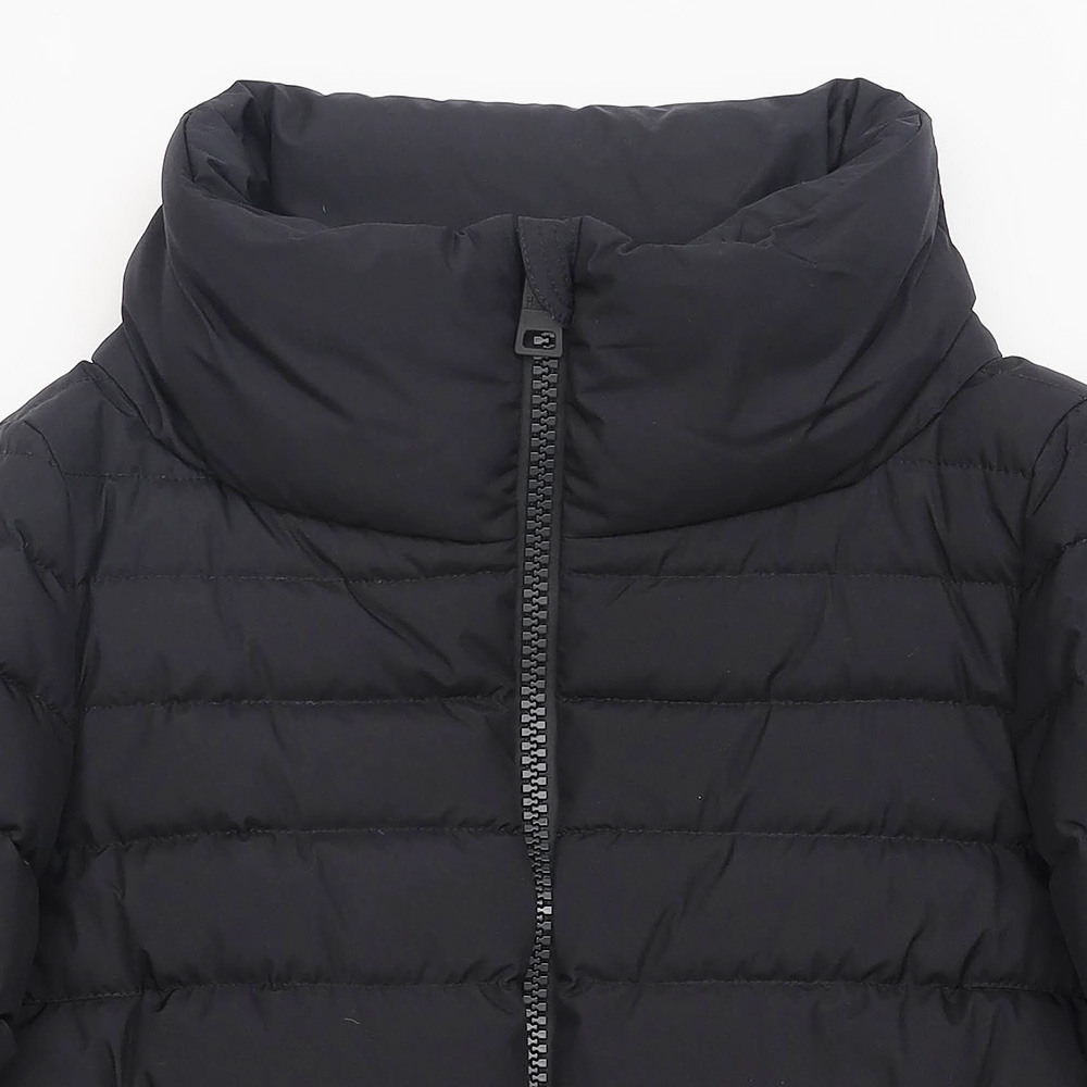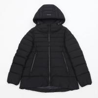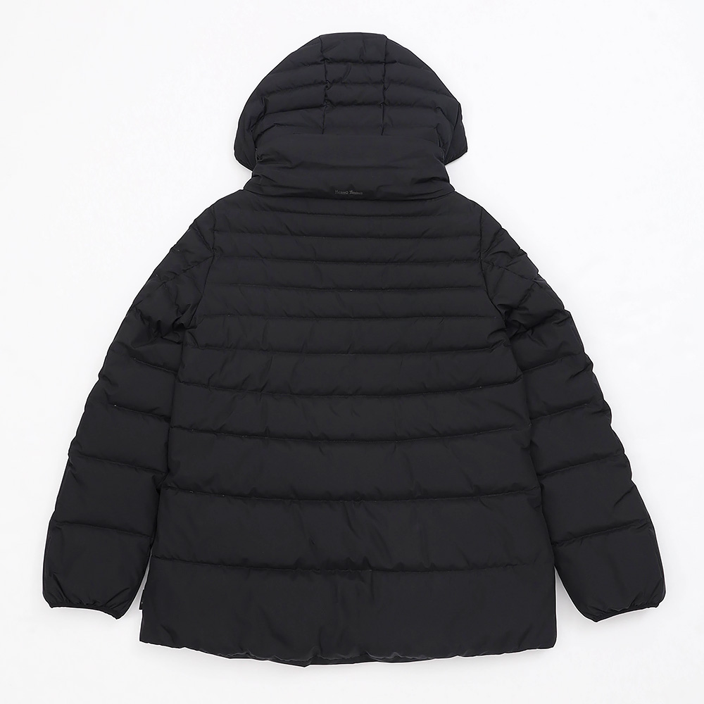 ショート丈ダウンコート。高めに配したネックのパターンと裾にかけて自然なAラインのシルエットが特徴。無駄の無いシルエットに加え、身頃のフィット感は保温性を高め、着用時の美しいシルエットを醸し出します。フード着脱可。