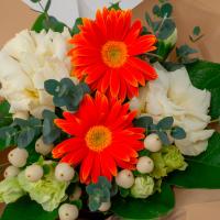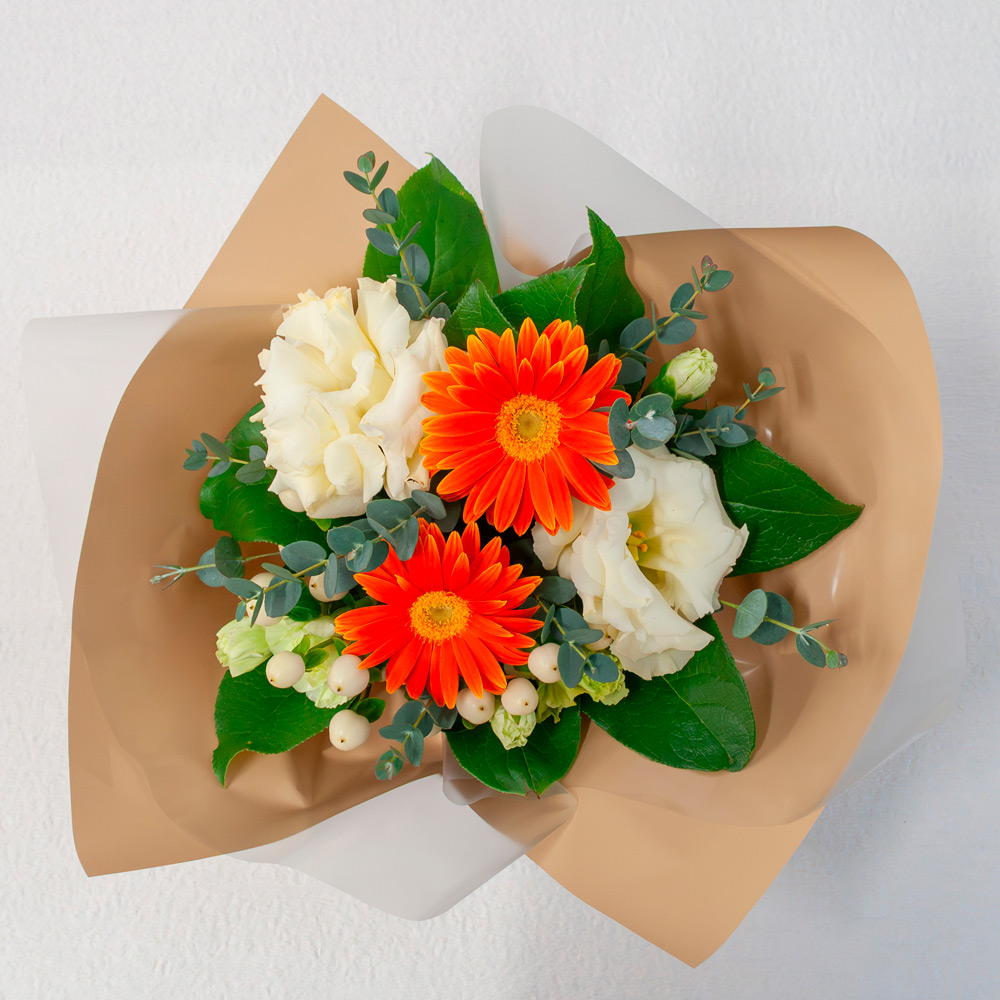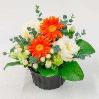 オレンジのビタミンカラーで仕上げた生花アレンジメントです。お部屋を鮮やかに彩り、贈りものにもおすすめです。