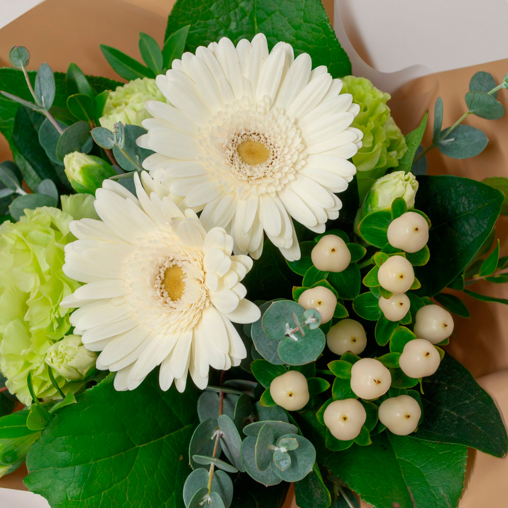 ホワイトチョコレートのようなスイーツのように仕上げた生花アレンジメントです。贈りものにもおすすめです。
