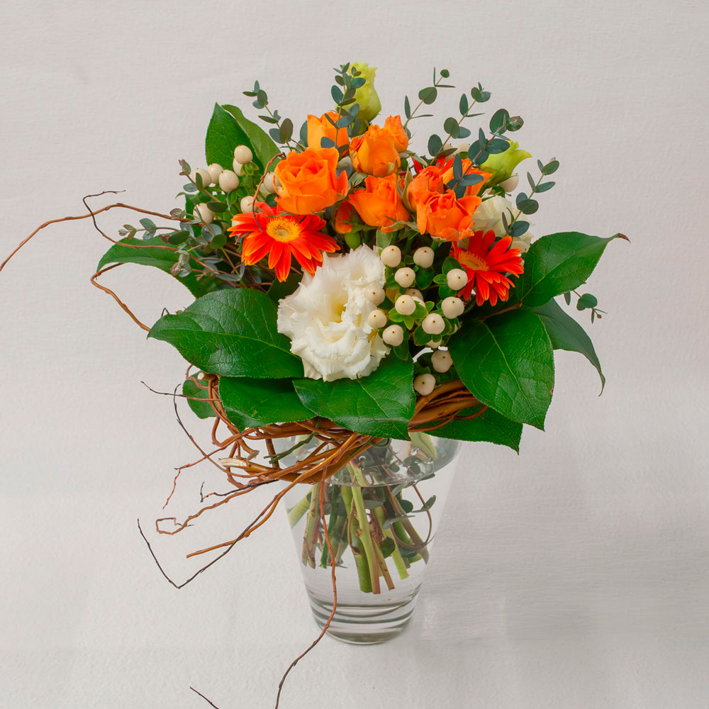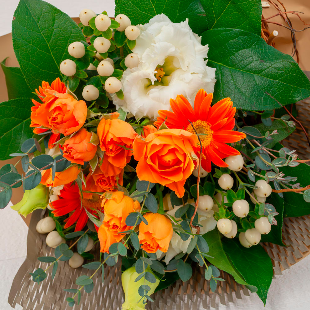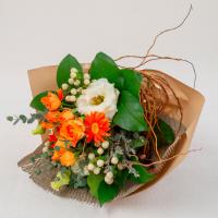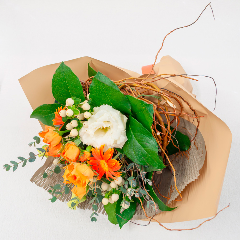 ビタミンカラーのお花をナチュラルブーケに仕上げました。贈りものにもおすすめです。