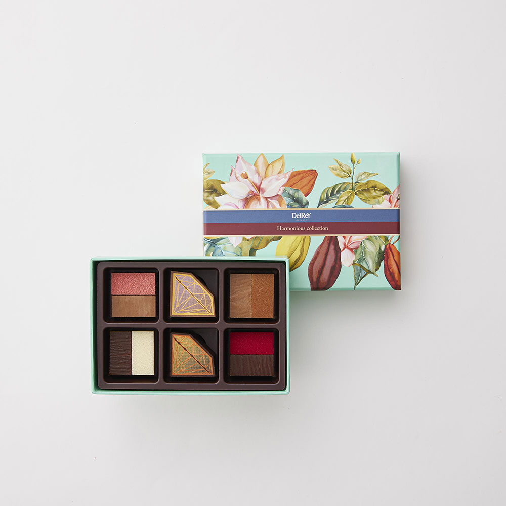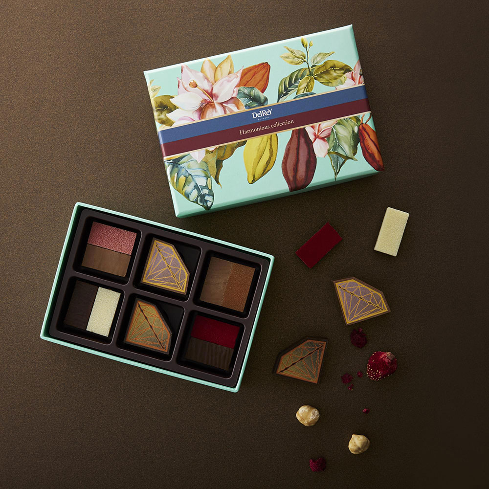 日本生まれの生チョコレートがベルギー・アントワープにて再解釈と共に更なる進化を遂げました。ストロベリー&ミルクチョコレート、バニラ&ダークチョコレート、ヘーゼルナッツ&ミルクチョコレート、ラズベリー&ダークチョコレートの生チョコレート4種と、香ばしい風味で人気なキャラメルガナッシュ、新作の甘酸っぱいストロベリージュレ&爽やかなレモンガナッシュのダイヤモンドショコラ2種を詰め合わせました。品種にもこだわり選定した香り高いカカオのアロマとフルーティーなテイストが折り重なった二層構造のハーモニーをお届けいたします。
