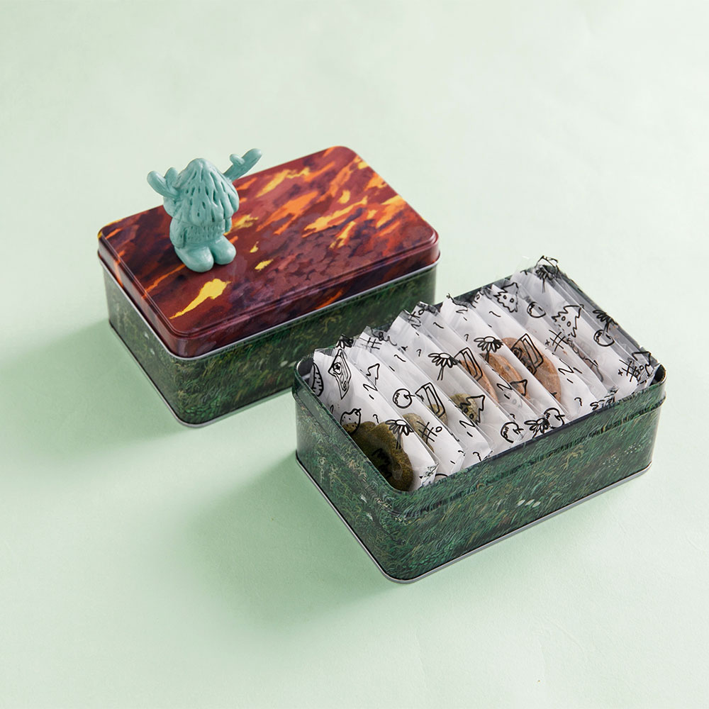 岡山県立美術館で開催された「平子雄一展 ORIGIN」にあわせ、白十字とのコラボレーションから生まれた「Sweet Tree」。展覧会を見終えたあと、その余韻をそっと持ち帰るように生まれたクッキー缶です。チョコチップ、チョコレート、抹茶の3種のクッキーは平子雄一が監修し、作品世界に通じる「かたち」や「間」を大切に焼き上げました。個包装フィルムやクッキーの造形にまで平子雄一の世界観を反映したオリジナルデザイン。チョコチップの形とミント色のモチーフは高島屋限定の特別仕様です。