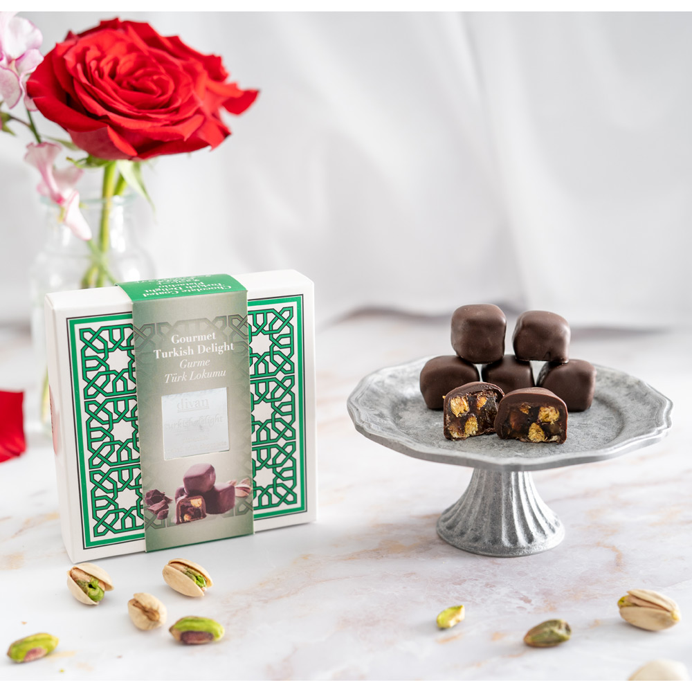 モダンで味わい深いdivan(ディヴァン)の看板商品。「天才たちのスイーツ」としても知られるターキッシュディライト(別名:ロクム)は、欧米では有名なお菓子。ダブル焙煎したピスタチオを贅沢に使いオリジナルレシピで作られた濃厚なビターチョコレートでコーティングしました。<ターキッシュディライトは>もちもちした食感が特長。ほんのりと優しい甘さのキューブ型のころんとしたシルエットが可愛いスイーツです。