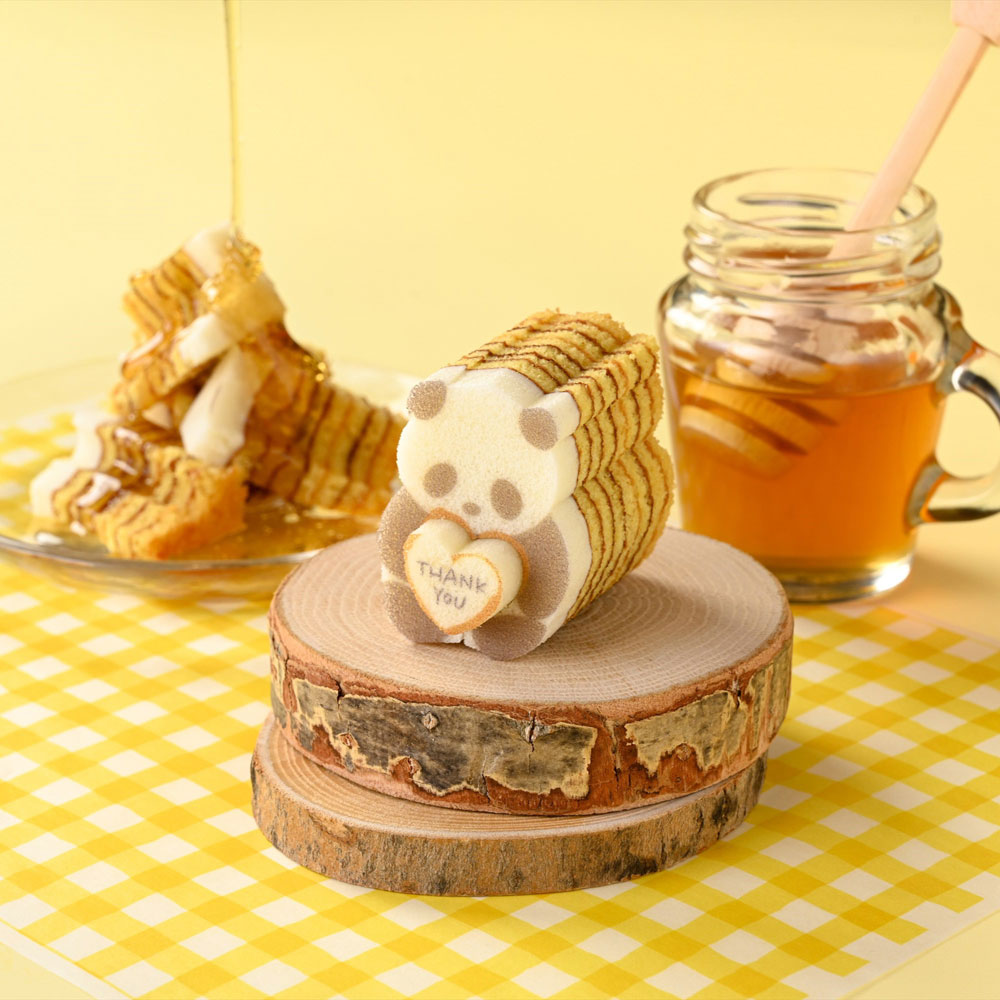 大切な人にそっと手渡したくなる、かわいいパンダバウムができました。想いを込めたハートを抱えた「Thank youパンダ」は、芳醇な香りとやさしい甘みが広がるはちみつ味。リボンのブランコにゆられる「リボンパンダバウム」は、香ばしい風味とナッツのコクが広がるピスタチオ味。定番プレーン味のパンダバウムと一緒に詰合せました。ホワイトデーにぴったりな、ありがとうを伝える贈りものです。