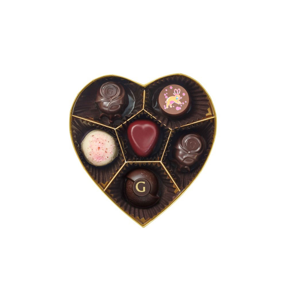 甘酸っぱいローズヒップガナッシュをほろ苦いダークチョコレートで包んだローズ形のチョコレートや酸味のあるラズベリーガナッシュが入ったハート形のチョコレートなどを優雅で美しいハート形のペーパーボックスに詰め合わせました。