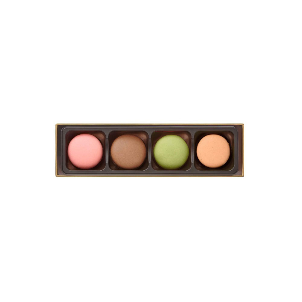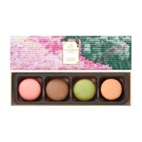 食感の異なるチョコレート、マカロン、ガナッシュのマリアージュをお楽しみください。期間限定の「桜&ホワイトチョコレート」と「塩キャラメル」「宇治抹茶&ミルクチョコレート」「ミルクチョコレート」の4種のフレーバーをカラフルに詰め合わせました。