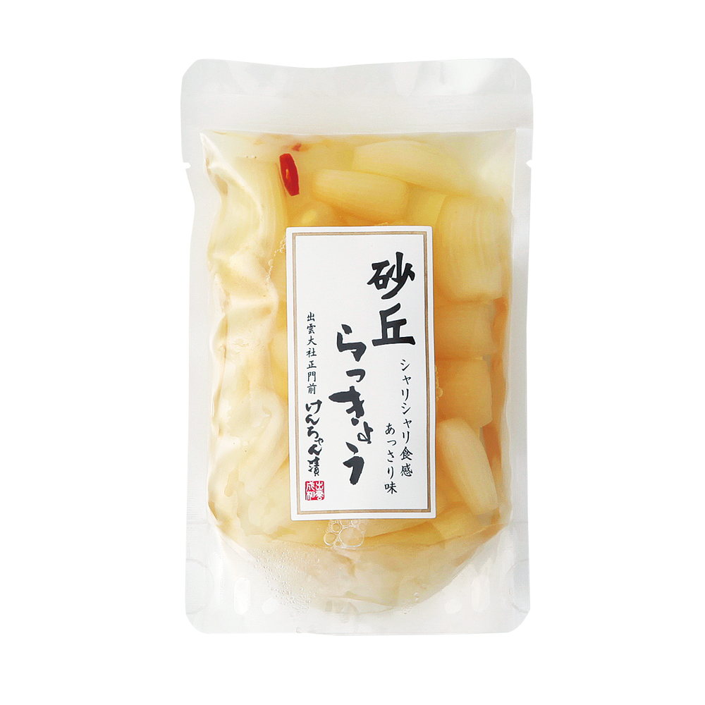 鳥取砂丘周辺の砂地で5月に採れたらっきょうを米酢と砂糖、食塩で漬け、低温熟成。ポリポリとした食感と風味を楽しめます。