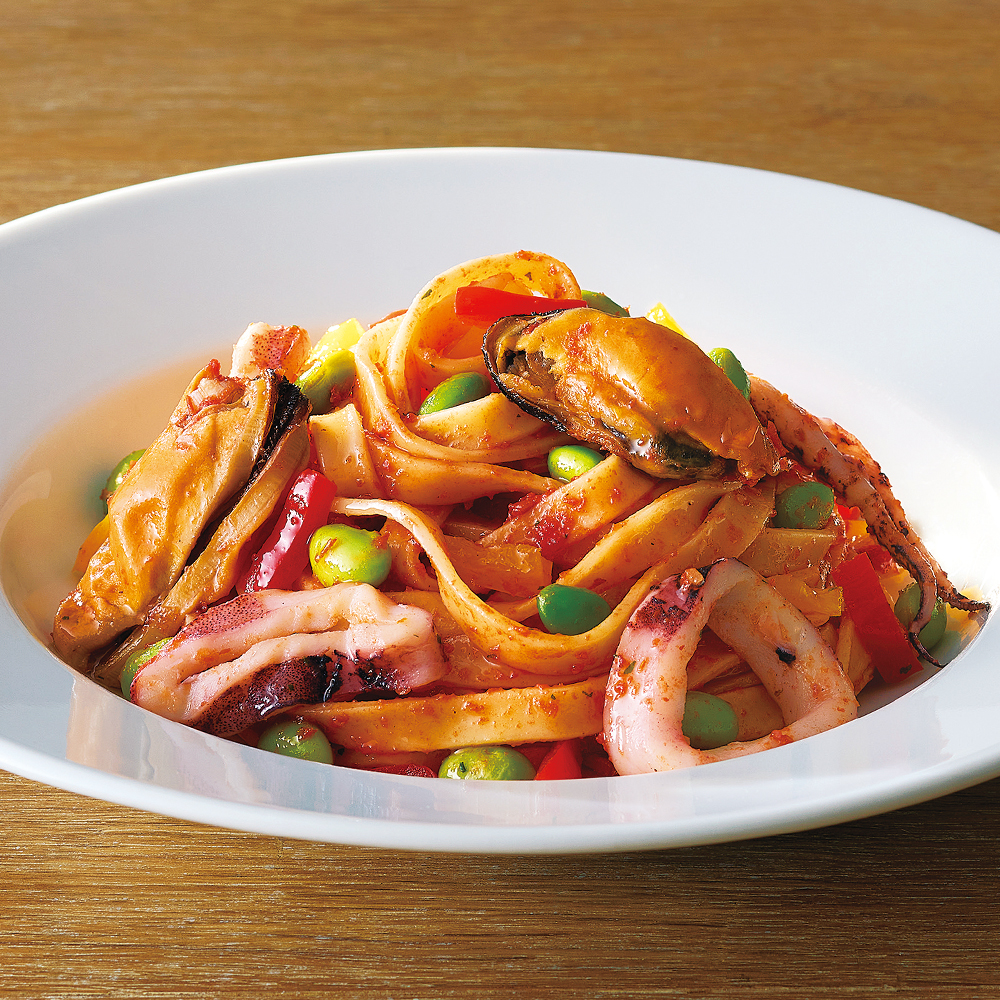 山形県産イ貝・するめいか・だだちゃ豆・パプリカを贅沢に使用した、具だくさんの本格パスタを。