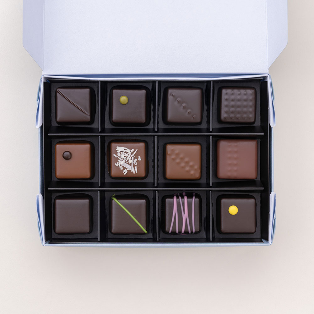 キャラメル・フルール・ド・セル・ベルモントエステート/F、ガナッシュ・フルール・ド・セル、プラリネ・ピスタチオ・ミルク、ガナッシュ・ミルク・ココ、キャラメル・カルヴァドス・ベルモントエステート/F、キャラメル・フランボワーズ・ベルモントエステート/F、ガナッシュ・シトロン・ヴェール、ガナッシュ・テ・ベルガモット、ガナッシュ・ベルモントエステート/F、キャラメルマンゴー&パッション・ベルモントエステート/F、プラリネ・ピーナッツ・フルール・ド・セ、プラリネ・ピスタチオ・フィユティーヌ・フルール・ド・セル・ミルク 12種類各1個(計12個)