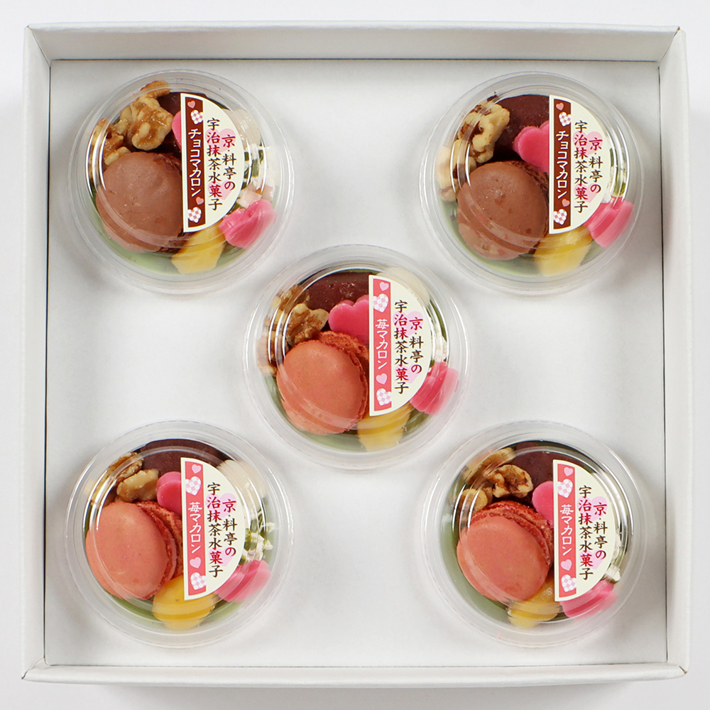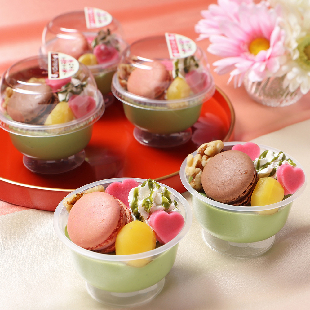人気の抹茶水菓子に、可愛らしいマカロンをおのせしたこの時期限定の宇治抹茶水菓子。