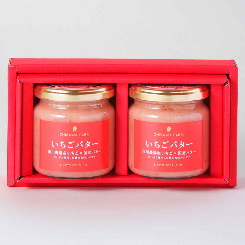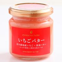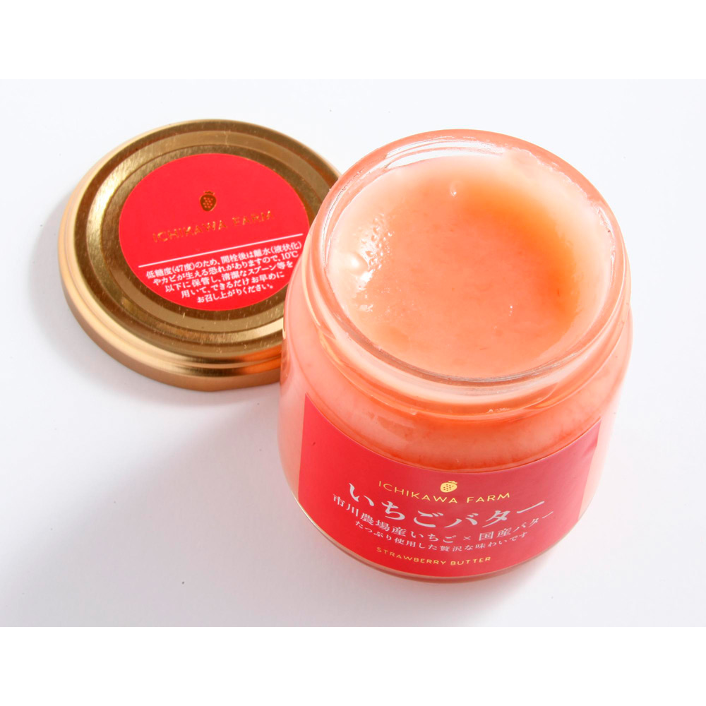 市川農場の自社農園で栽培されたいちご「あきひめ」と、北海道バターを使った贅沢ないちごバターです。いちごのさわやかな甘みとバターのコクは他にはない美味しさです。パンにつけてお召し上がりいただくと、いちごの香りと甘さ、バター風味もしっかり味わえる、おいしい一品です。