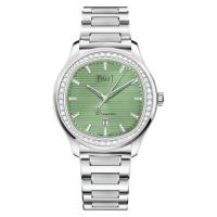 36mm、ステンレススチール製ケースにラウンドブリリアントカットダイヤモンド60個(約0.97ct)、パステルグリーンの文字盤にラウンドブリリアントカットダイヤモンド36個(約0.08ct)をセットしたステンレススチール製インデックス、フォールディングバックル、サファイアケースバック、インターチェンジャブルストラップ、500P1自社製自動巻ムーブメント