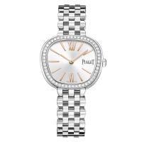 ステンレススチール製トラペーズシェイプケースにラウンドブリリアントカットダイヤモンド51個(約0.52ct)、サテン仕上げしたシルバーカラーのソーラー文字盤、ステンレススチール製ブレスレット、ピアジェ57Pクオーツムーブメント