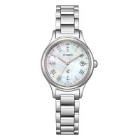 美しい艶と個性が光るシンプルでクリーンな印象の白蝶貝文字板モデル。「光の環」をイメージした、すっきり細く艶やかなベゼルに文字板を彩るカットパーツ。光の粒をイメージしたガラス淵のミルグレインリングは女性の輝きとしなやかさを表現しています。ケース、バンドには表面硬化技術デュラテクト「エターナルプラチナ」を纏い、プラチナパウダー配合で白く美しいモデルです。白蝶貝文字板はインデックスをオールシルバーで統一しクリーンな印象を与えます。