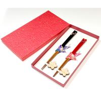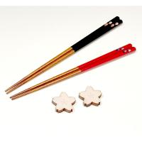 持手部分に桜の花びらのモチーフを施した華やかなお箸と、桜の花をモチーフにした木製のお箸置きのセットです。日常使いに便利な兵左衛門の食洗機対応箸は、箸先に天然素材の漆のみを使用した、口当たり滑らかなすり漆仕上げです。