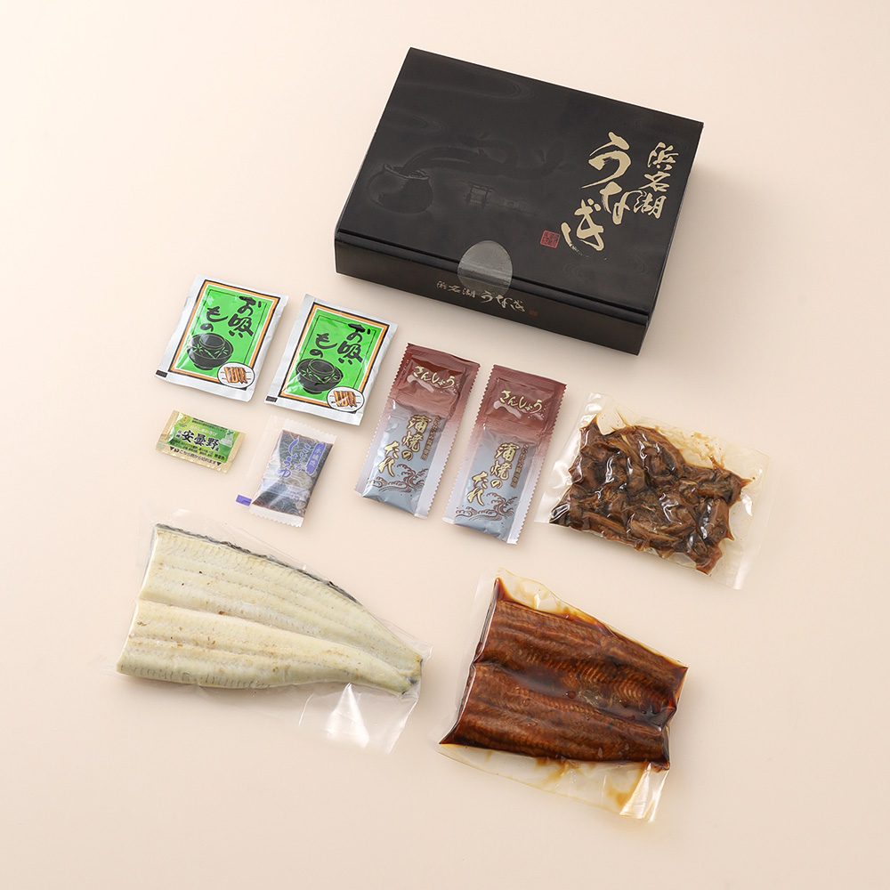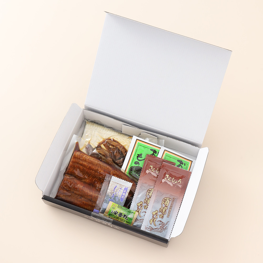うなぎ蒲焼(カット)110g、うなぎ白焼(カット)100g、肝蒲焼50g、たれ&山椒×2、わさび×1、醤油×1、粉末吸物×2