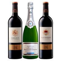 シャルル・ド・カザノーヴ・ブリュット(白シャンパン/フランス・シャンパーニュ/辛口)、デュロン・マルゴー(赤/フランス・ボルドー・マルゴー/フルボディ)、デュロン・サンテミリオン(赤/フランス・ボルドー・サンテミリオン/フルボディ)各750ml 計3本