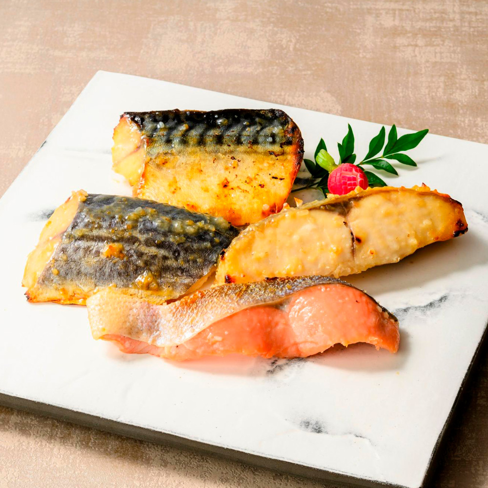 銀ひらす西京漬け60g、鯖西京漬け60g、秋鮭西京漬け60g、さわら西京漬け70g 各2