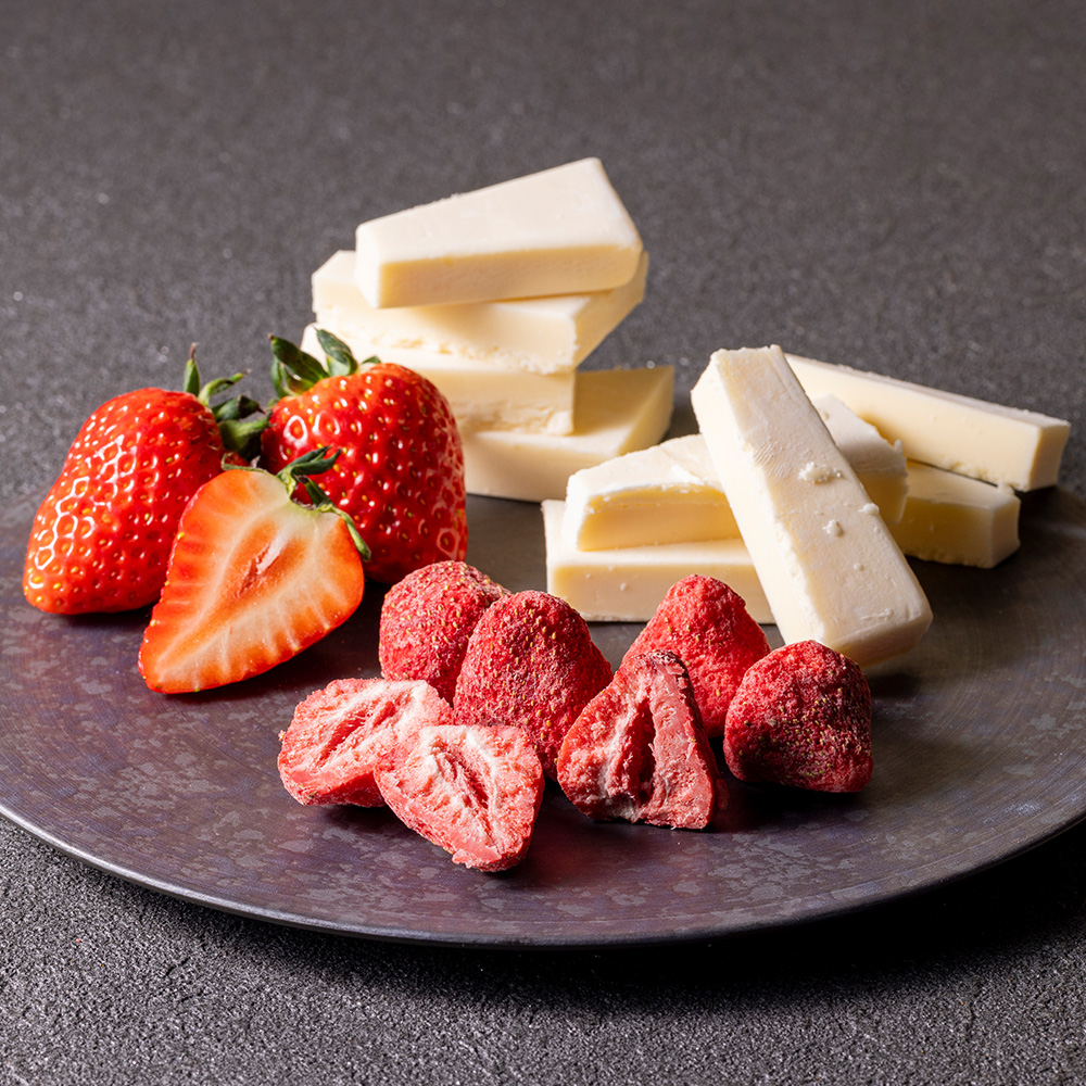 <弁才天>一番人気のいちご大福と染みチョコいちごを組み合わせた、いちごが満喫できるセットです。染みチョコいちごはフリーズドライにしたいちごにホワイトチョコをたっぷりと浸み込ませた新食感のスィーツです。