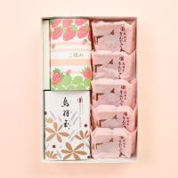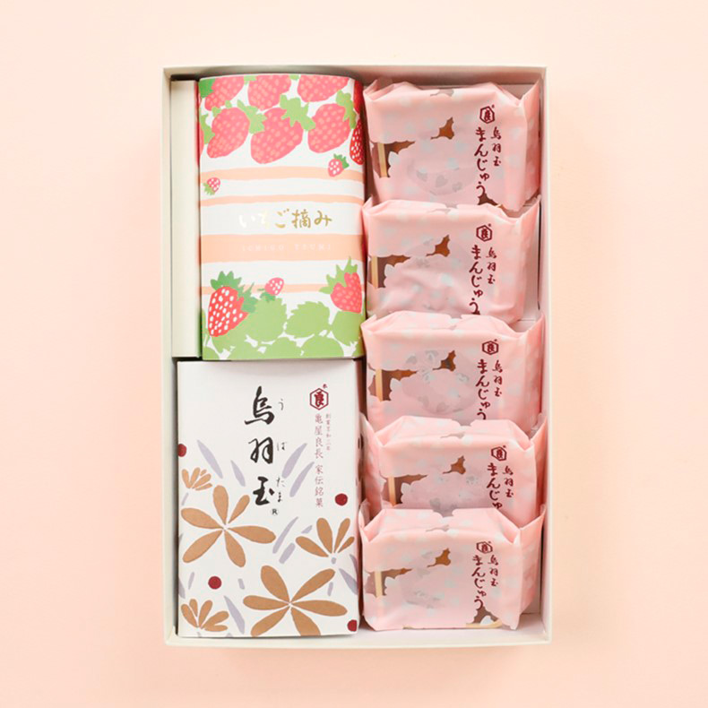 烏羽玉6個入1箱、烏羽玉まんじゅう<さくら>5個、棹菓子<いちご摘み>1本