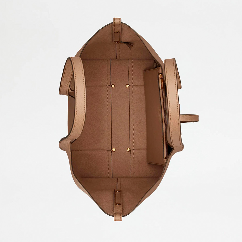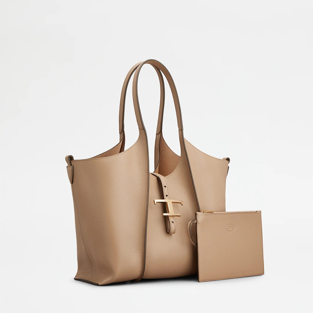 しなやかな曲線を描く、柔らかなカーフ レザーのショッピング バッグ。リブ、ロゴ入りの T タイムレス メタル ペンダント アクセサリー、ダブル ハンドルが特徴です。内部の広いコンパートメントに取り出し可能なポーチを合わせました。