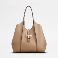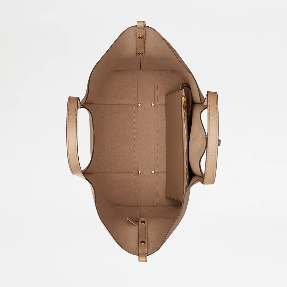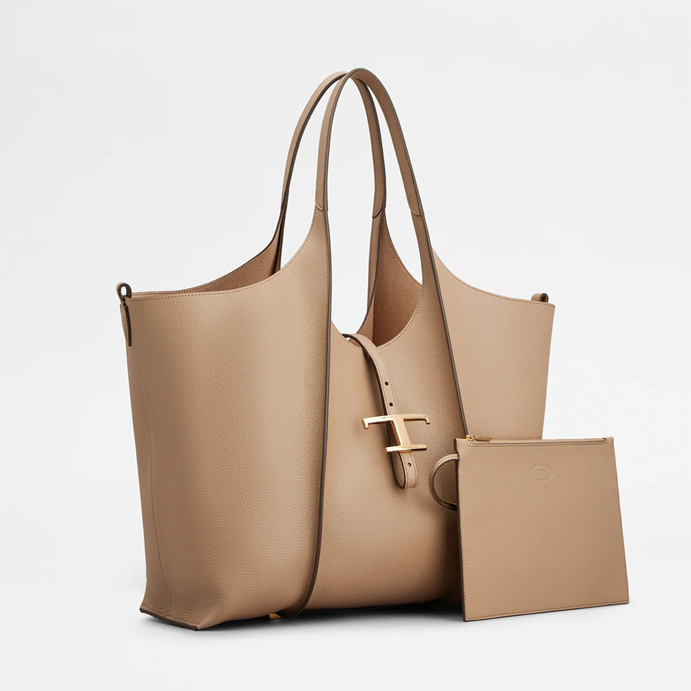 しなやかな曲線を描く、柔らかなカーフ レザーのショッピング バッグ。リブ、ロゴ入りの T タイムレス メタル ペンダント アクセサリー、ダブル ハンドルが特徴です。内部の広いコンパートメントに取り出し可能なポーチを合わせました。