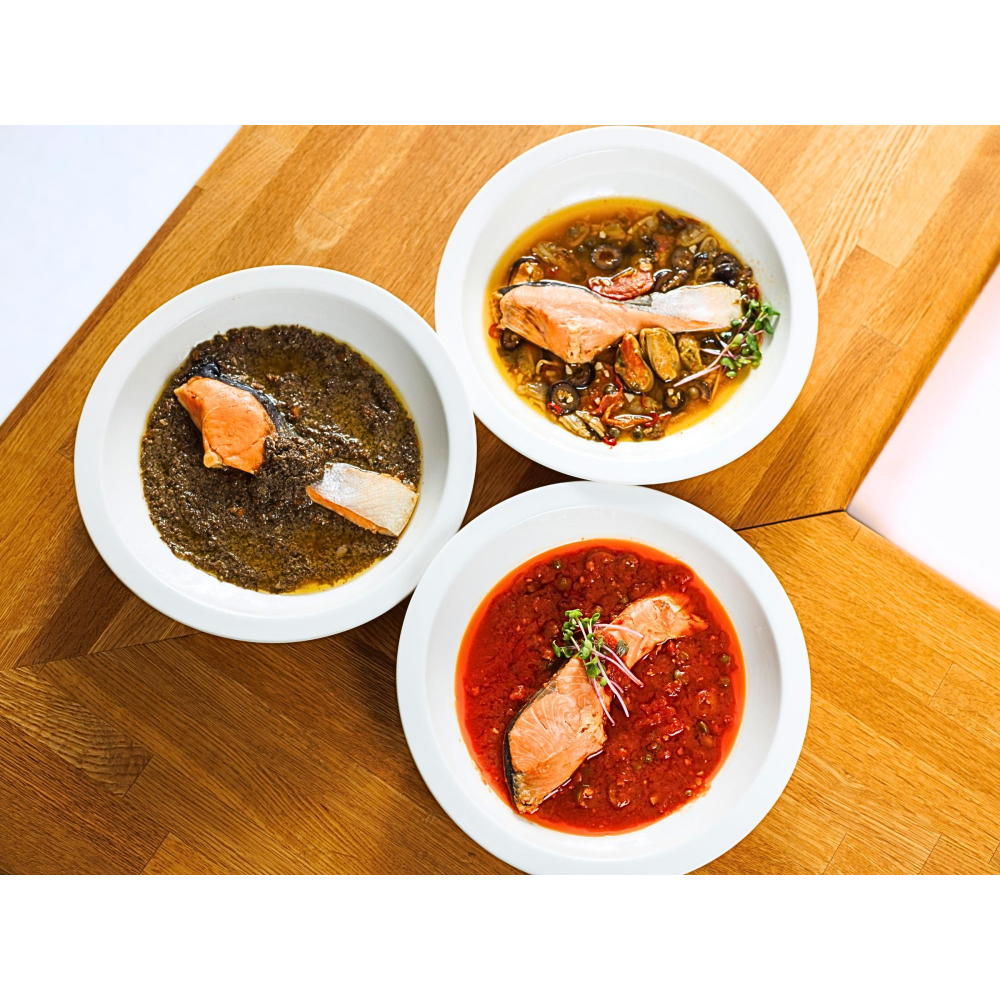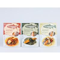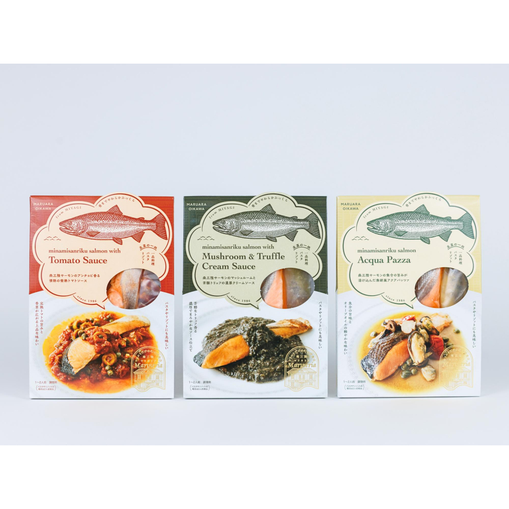 南三陸サーモンのアンチョビ香る情熱の完熟トマトソース(具1切/ソース150g)、南三陸サーモンの魚介の旨みが溶け込んだ漁師風アクアパッツァ(具1切/ソース150g)、南三陸サーモンの芳醇トリュフとマッシュルームの濃厚クリームソース(具1切/ソース150g)