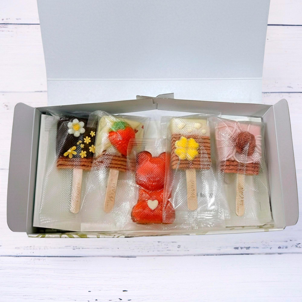 <ベアーフィナンシェ>いちご×1、<VIVANT BAR(びばぁーんばー)>ストロベリー×ダーク×1、ストロベリー×ホワイト×2、ストロベリー×いちご×1(バウム×コーティングチョコレートの組み合わせとなります。)