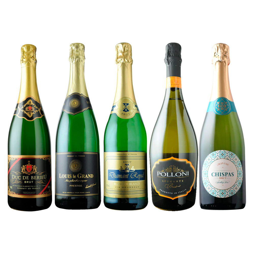 デュック・ド・ベリュ/グラン・ヴァン・ド・ジロンド/フランス、ルイ・ル・グラン・ブラン・ド・ブラン/ドメーヌ・ピエール・シャヴァン/フランス、ディアマン・ロワイヤル・ブリュット/カーヴ・ド・ヴィサンブール/フランス、ポローニ・スプマンテ・ブリュット/ワインピープル/イタリア、チスパス・ブリュット/ロング・ワインズ/スペイン すべて白泡・辛口 各750ml 計5本