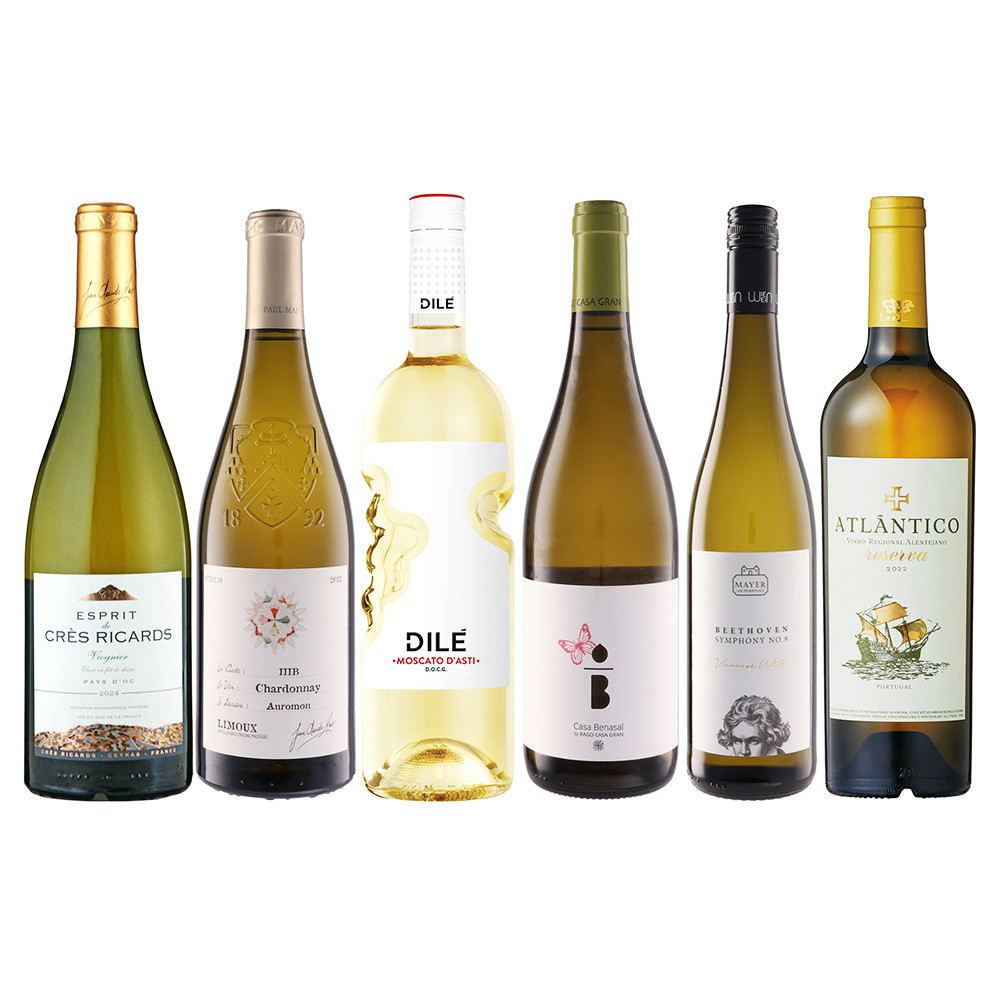 エスプリ・ド・クレ・リカール ヴィオニエ2024/ドメーヌ・ポール・マス(辛口/フランス)、IIIB(トワベー)・エ・オウモン 白2023/ドメーヌ・ポール・マス(辛口/フランス)、ディーレ モスカート・ダスティ2024/サンテロ(甘口・微発泡/イタリア)、カサ・ベナサル ゲヴュルツトラミネール/モスカテル2024/パゴ・カサ・グラン(辛口/スペイン)、グリューナー・ヴェルトリーナー ベートーヴェン 第九 ラベル2024/ヴァイングート・マイヤー・アム・プァールプラッツ(辛口/オーストリア)、アトランティコ レゼルヴァ 2023/カザ・レウヴァス(辛口/ポルトガル)すべて白 各750ml 計6本