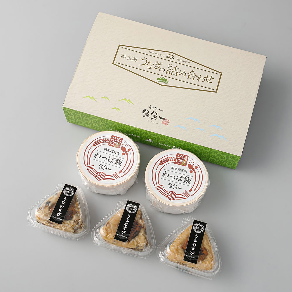 <魚魚一>のこだわりがつまった、浜名湖産うなぎのわっぱ飯と、手軽に食べられるうなむすびのセットです。うなぎは浜名湖産を使用。蒲焼とごぼう、静岡茶で炊き上げたおこわ飯は絶品。レンジで手軽に温められるため、お手軽にお召しあがりいただけます。