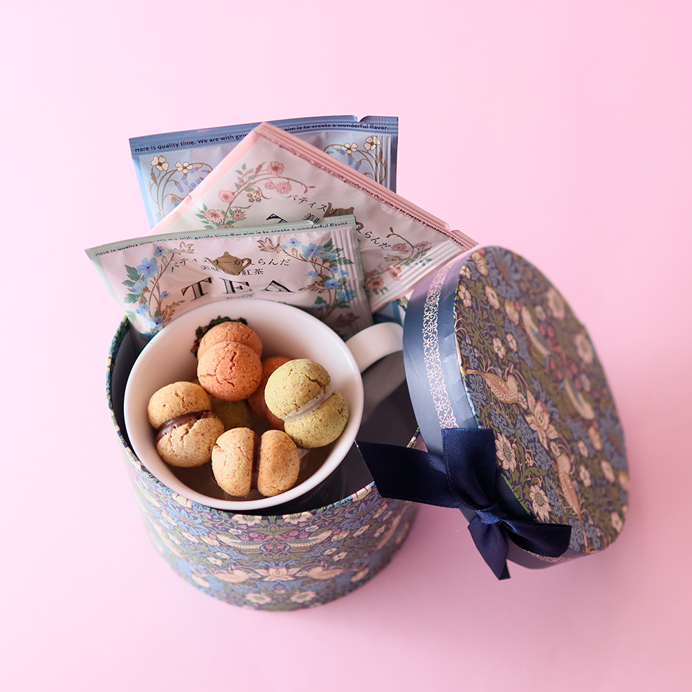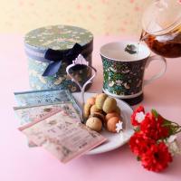 ウィリアムモリス柄の優美なデザインを施したマグカップにコロンと可愛いバーチディダーマを入れました。フルーツフレーバーの紅茶と一緒にお届けします。バーチ・ディ・ダーマ(Baci di dama):イタリア語で「貴婦人(dama)のキス(baci)」という意味がある、イタリア(トリノ)の伝統的なお菓子です。紅茶3種:「マスカットグレープ」マスカットの香り高いすっきりした味わいのストレートティ。「白桃アールグレイ」アールグレイの香りの中にほんのり白桃が香る癖のない味わい。「フルーツバスケット」マンゴー、リンゴ、アプリコットなどのフルーツにメープルを合わせた華やかな香りのブレンドティー。