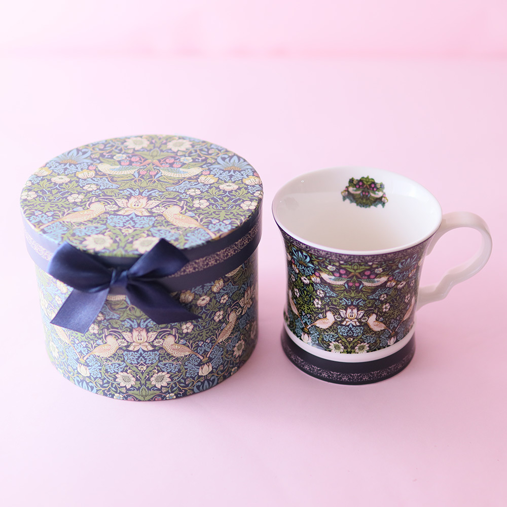 マグカップ:サイズ直径9cm×高さ9cm(化粧箱入り ウィリアムモリス柄 いちご泥棒)×1、紅茶ティーバッグ×3包(マスカットグレープ、白桃アールグレイ、フルーツバスケット 各1)、バーチディダーマ×8(プレーン3、ピスタチオ2、苺3)