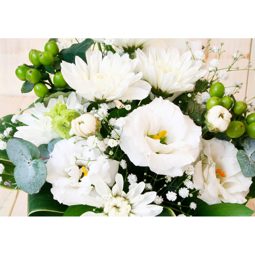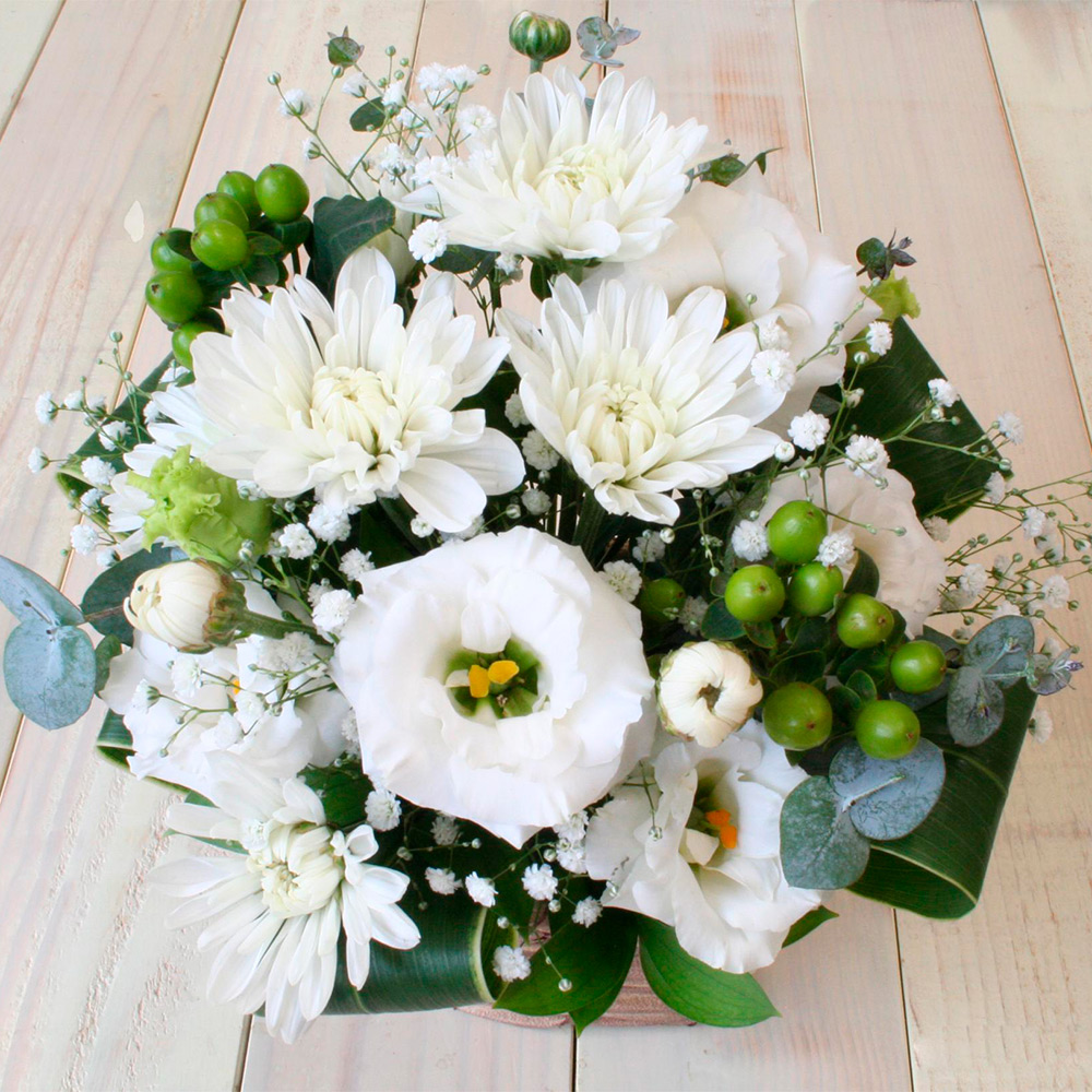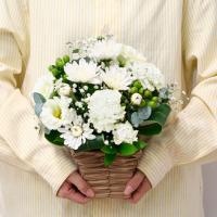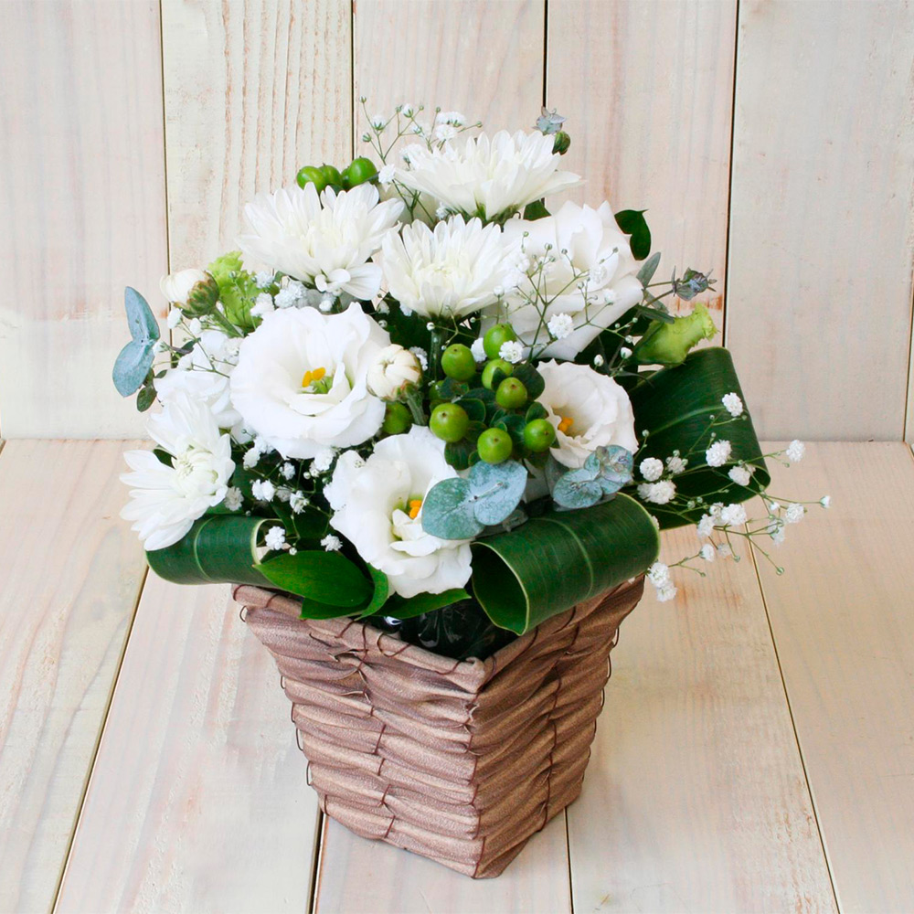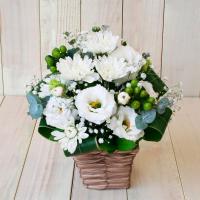 トルコキキョウ、マム、カスミソウなどの複数の種類の花をあしらい、全体的に白と緑を基調とし爽やかで優美な印象のデザインです。バスケットにアレンジしているので花瓶を必要とせずそのまま飾ることが出来ます。故人を偲び、供養の気持ちを伝えるお供え用アレンジメントです。