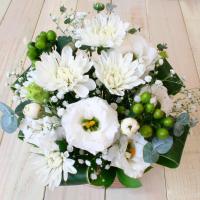 白と緑を基調とした落ち着いた雰囲気のお供え用アレンジメントです。