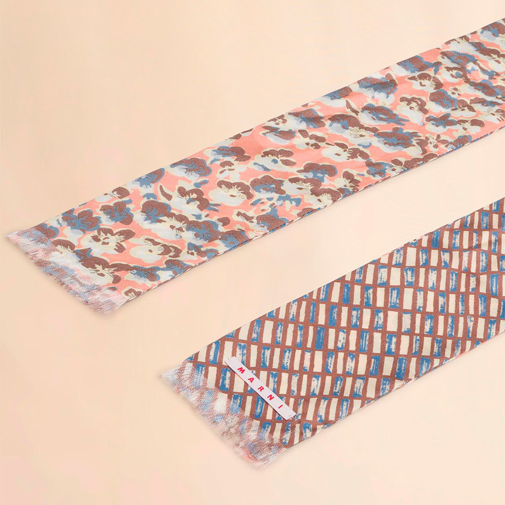 花柄とチェック柄を両面にデザインしたリバーシブル仕様のシルク製のタイスカーフ。