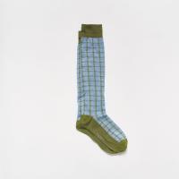 コットン混素材のチェックジャガードソックス。ハイソックスで履き口のリブ部分にロゴ入り。