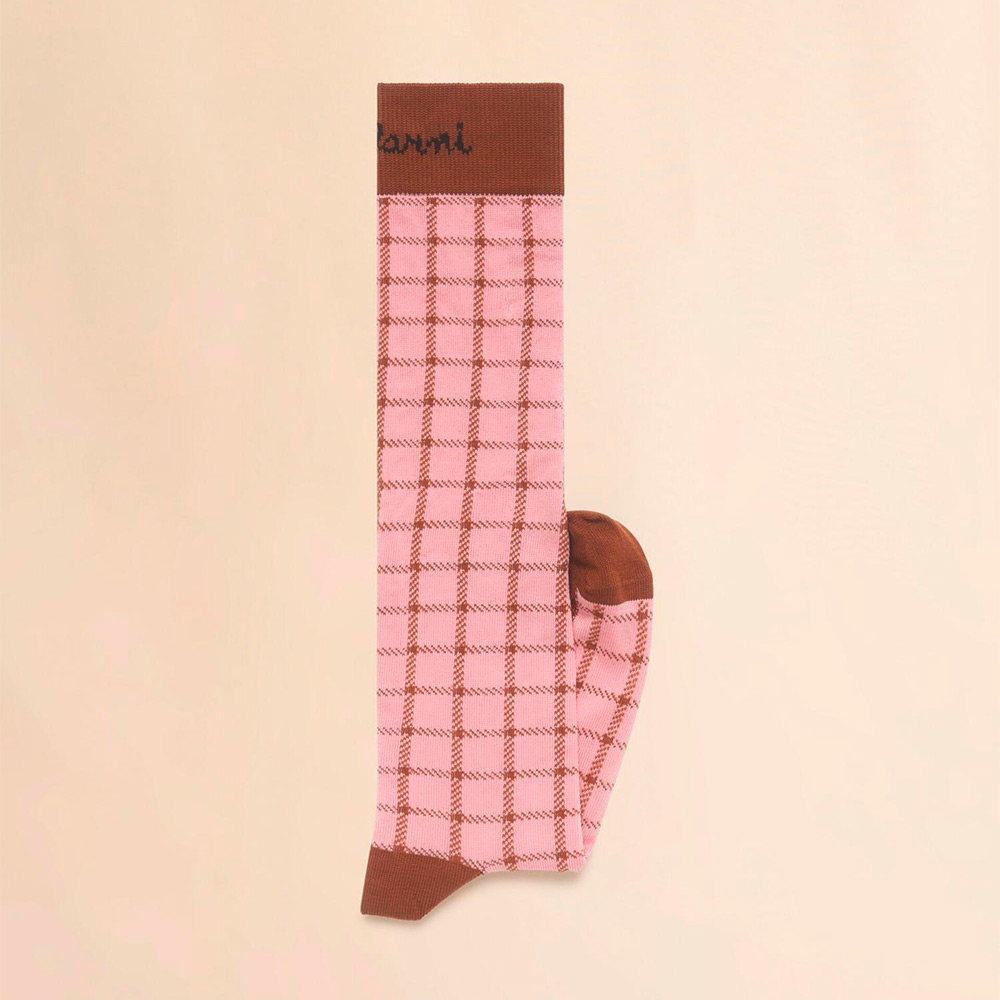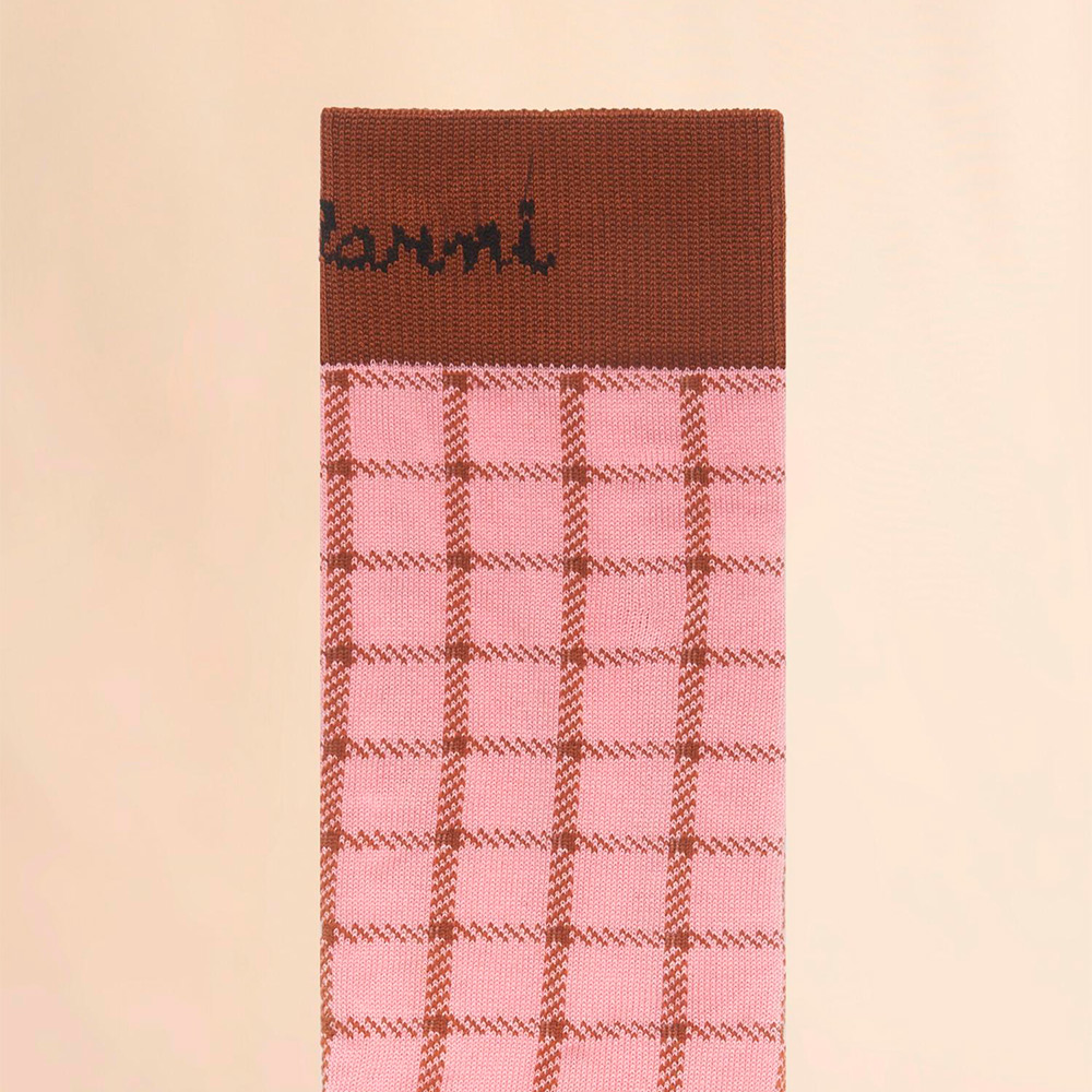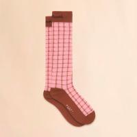 コットン混素材のチェックジャガードソックス。ハイソックスで履き口のリブ部分にロゴ入り。