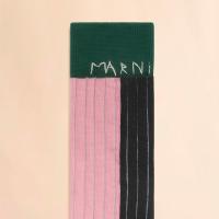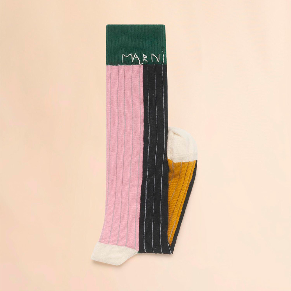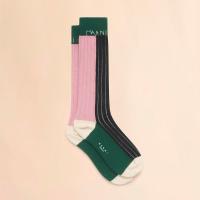 コットン混素材のカラーブロックソックス。ハイソックスで履き口のリブ部分にロゴ入り。