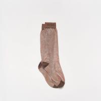レーヨン混素材のカラーブロックシアーソックス。ミドル丈で履き口のリブ部分にロゴ入り。