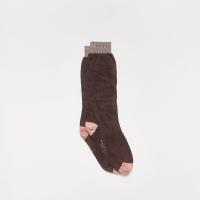 レーヨン混素材のカラーブロックシアーソックス。ミドル丈で履き口のリブ部分にロゴ入り。