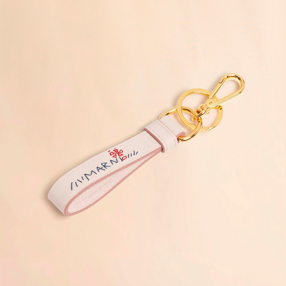 カーフレザー製のストラップが付いた「MENDING」キーホルダー。カラビナフック付き。ハンドステッチでほどこされたメンディングロゴにデザインされたフラワーモチーフが愛らしいアクセントに。